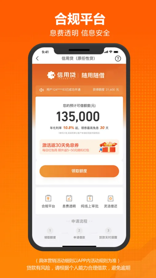 1.【新人30天免息】:即日起至2023年6月30日,首次申请开通任性贷的用户,开通成功随机返30天借款优惠券(随机再送5~50元无门槛支付券);每种奖品数量有限,发完即止,具体活动细则以APP内展示为准。
