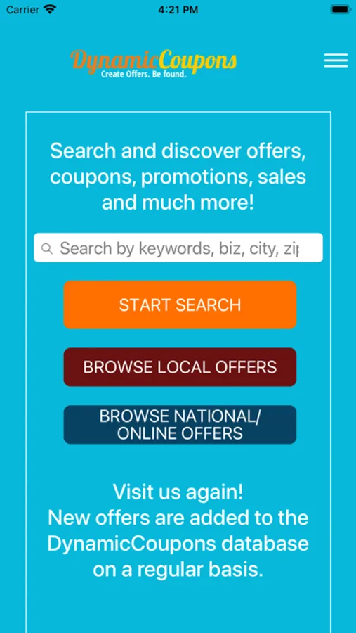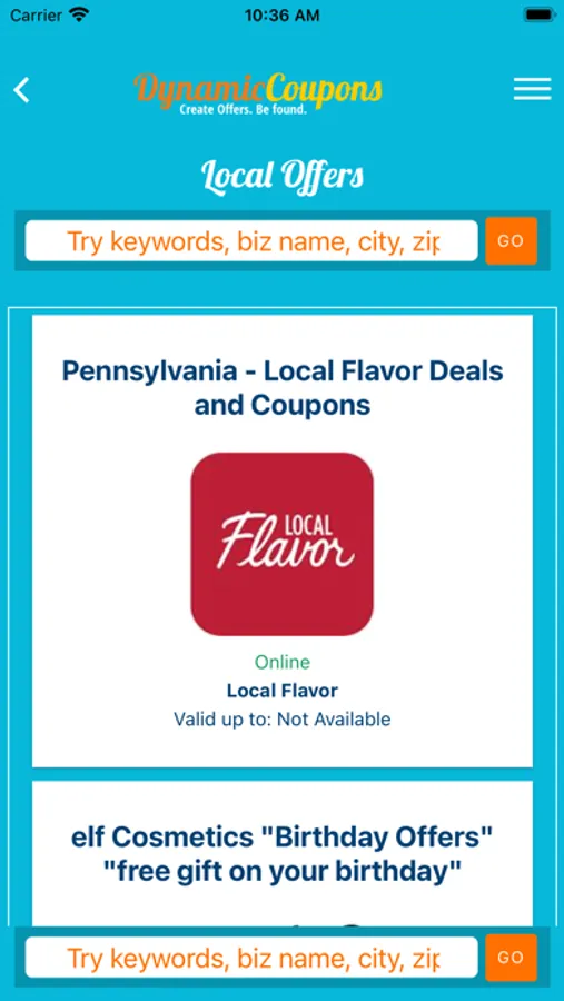 Register, enter details. Upon approval, get published in our searchable DynamicCoupons database. Users search by keywords, business name, address, zip code etc, Start FREE.