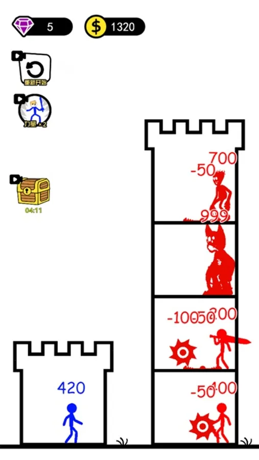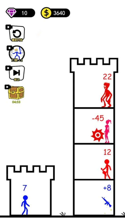 一款好玩的火柴人爬塔小游戏,打倒敌人可以变强,装备也多种多样,在这款游戏中每一个火柴人都有指定的数字,爬上高塔打败恶魔,你需要根据数字去做加减乘除来提升自己的战斗力拯救公主