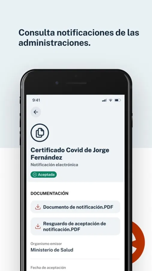 - Lets you consult your notifications, which are organised into pending and accepted notices. The app tells you number of days until your notification will expire, along with a colour code, to help you see how much time you have to access and comply with the notifications. You can also see the details of each notification, comply with it to access all the information in the notification and obtain a confirmation document. After you have complied with a notification, you can consult it again in the completed notifications section, where you will still have have access to the notification details and the confirmation document.