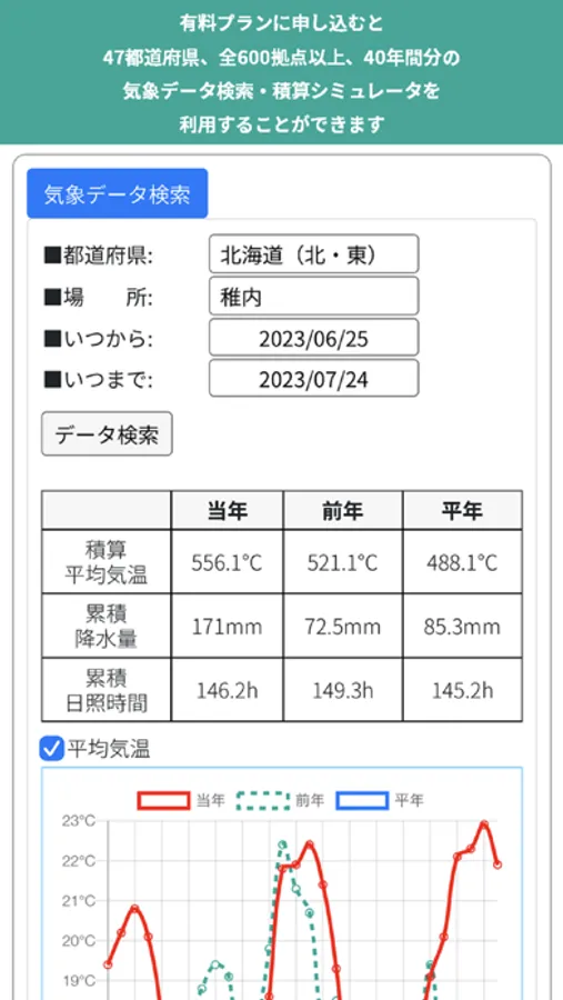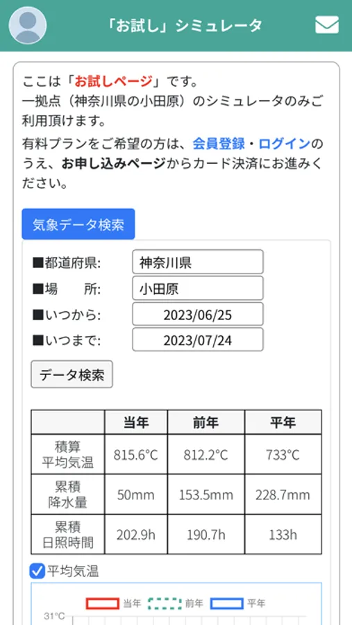 『① 開始日と終了日』『② 開始日と目標値』『③ 終了日と目標値』の三パターンを使用可能で、算出期間内の気温・降水量・日照時間をグラフとデータで表示します。