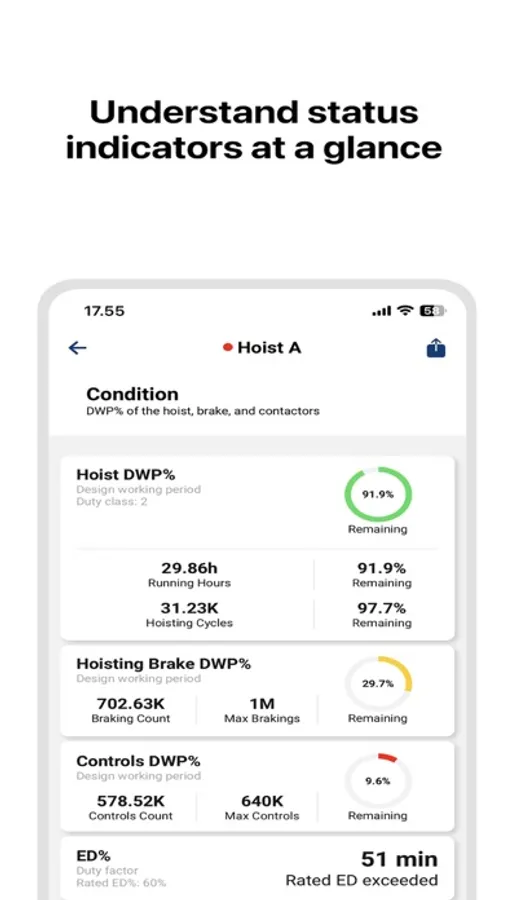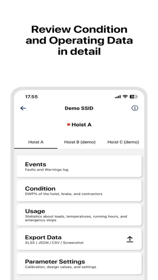 Demag Equipment App enables users to check the condition of their Demag hoists wirelessly. Contact Demag Cranes & Components GmbH for more information (e.g. hardware requirements).