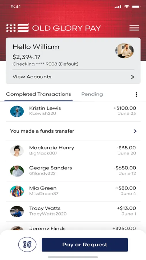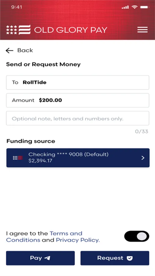 Old Glory Pay is Old Glory Bank's peer-to-peer (P2P) platform that’s America’s first digital cancel-proof payment system. With Old Glory Pay, existing Old Glory Bank customers can quickly, securely, and privately exchange funds with other Old Glory Pay users at no cost. The app is lightning fast, free, and available to all our customers with a spending account.
