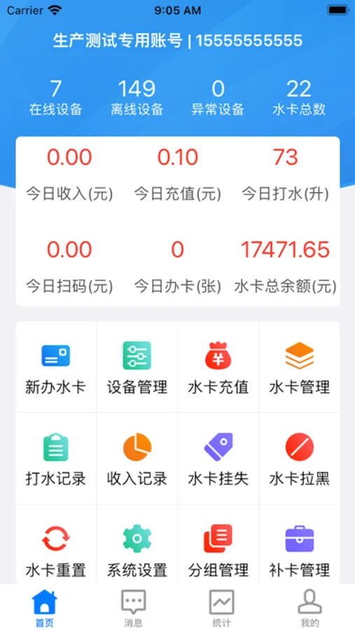 物联网智能售水站,为水站店家提供的管理端APP。通过APP可以远程管理水站,办卡、充值、挂失、设置售水单价等等,让水站的店家管理店铺更容易。