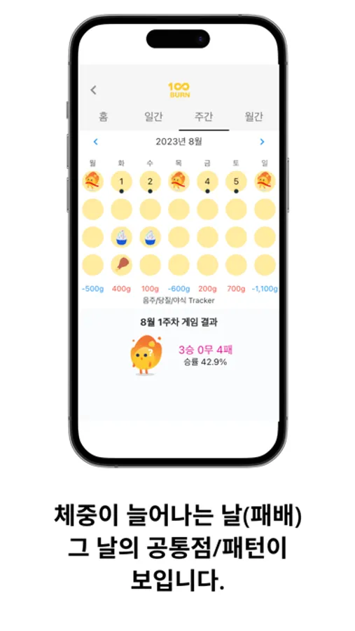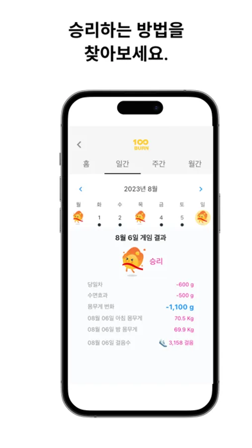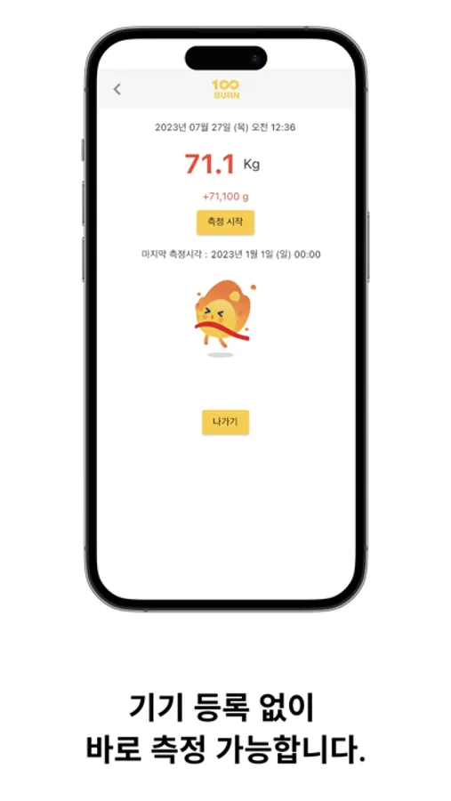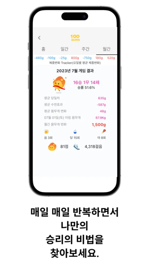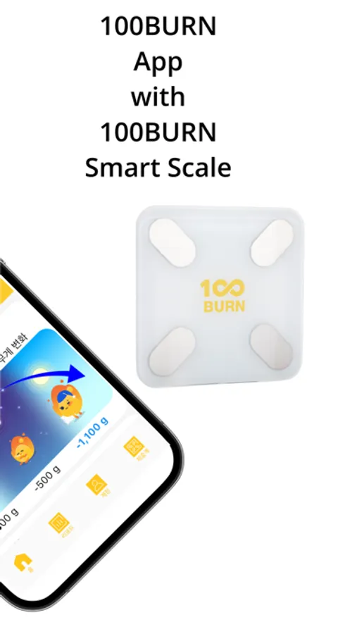 100g을 태우도록 돕는 스마트 체중계 100BURN, 100g 감량하는 방법을 익히고 반복하도록 돕습니다.