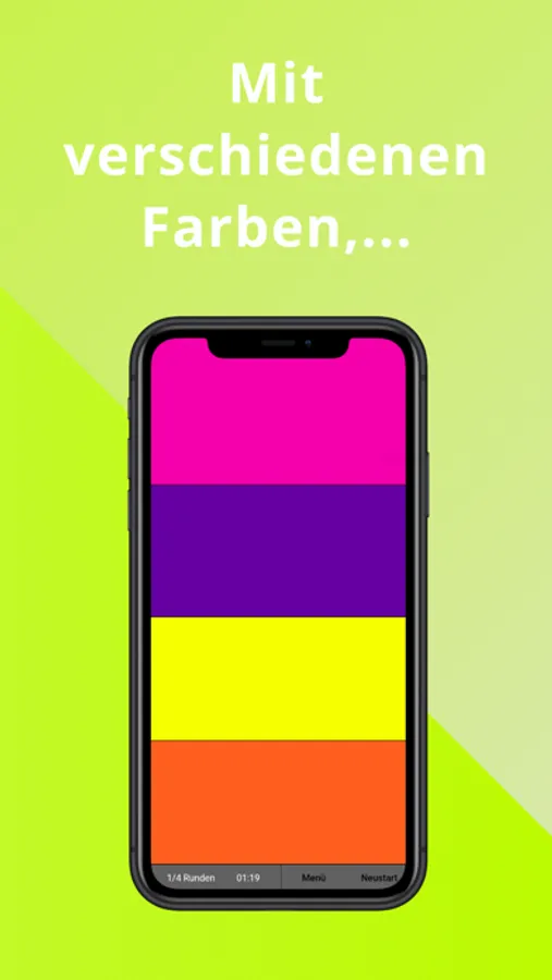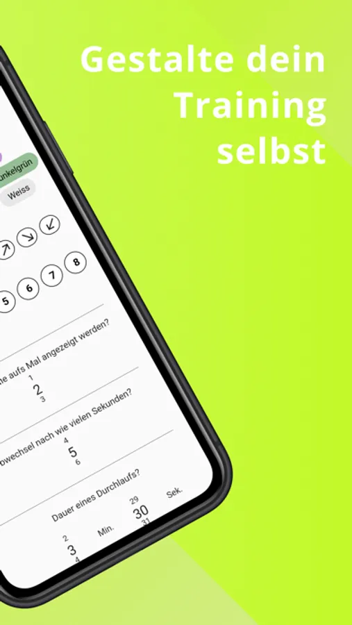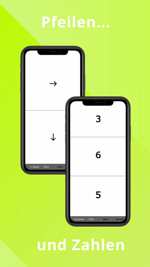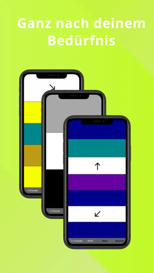 Choose between colors, arrows and numbers. Decide how many colors, arrows or numbers are displayed at once and how long they are visible. Decide for yourself how long a round challenges you and how long the recovery period lasts.