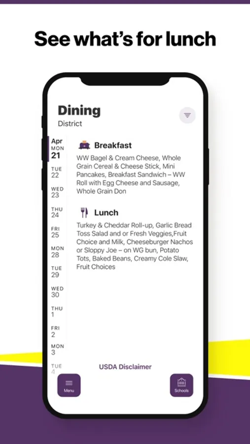 Within the dining section, you'll find an easy to navigate, weekly menu, sorted by day and meal type.