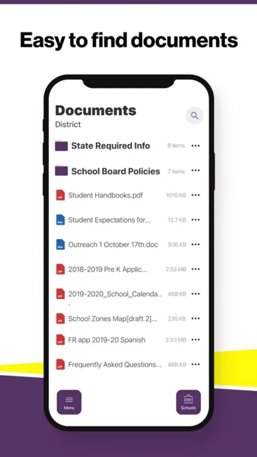The event section shows a list of events throughout the district. Users can add an event to their calendar to share the event with friends and family with one tap.