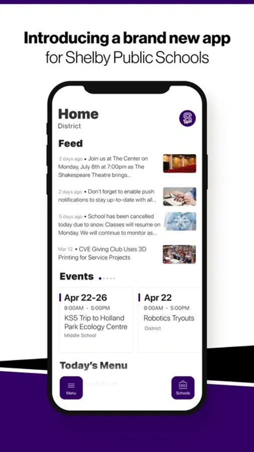 The event section shows a list of events throughout the district. Users can add an event to their calendar to share the event with friends and family with one tap.