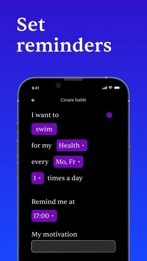 Set your personalized reminder. How many times a day do you want to get reminded? Add your time range, and your motivation, and save. Your new habit is ready!