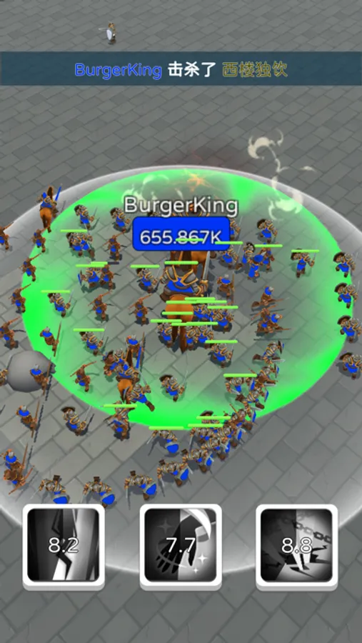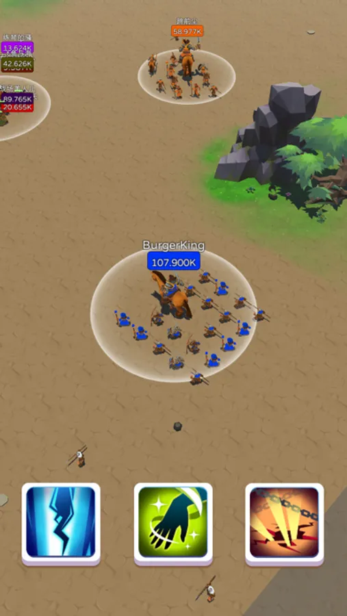 在每场游戏开始时,你将面对12名对手,他们和你一样,是光杆司令,不断在地图上跑来跑去,寻找中立小弟来壮大自己的队伍。地图上会定期刷新不同兵种的中立小弟,包括长枪手、弓箭手、骑兵、法师和麒麟。你需要抓住时机,在战场上给敌方武将最后一击,这样你就能获得他的全部军队,成为场上的霸主。