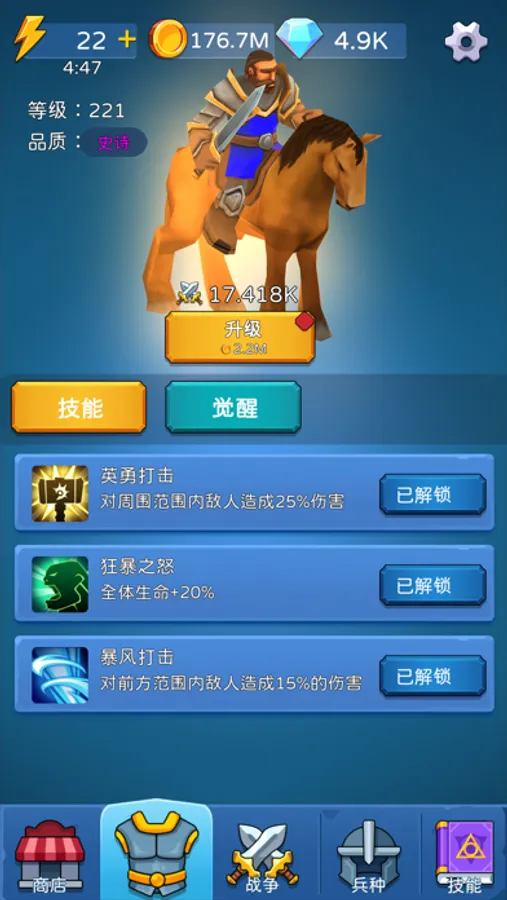 你可以为自己招募到的兵种升级,并在到达一定级别时觉醒,觉醒后将解锁被动能力。例如,你的兵种可以学会反弹远程攻击,让你的敌人无从下手。你也可以升级你的英雄,并在到达一定级别时觉醒,不同层次的觉醒可以解锁新的被动技能。例如,你的英雄可以觉醒到一定层次后攻击时有几率产生溅射伤害,让你的敌人无处可逃。