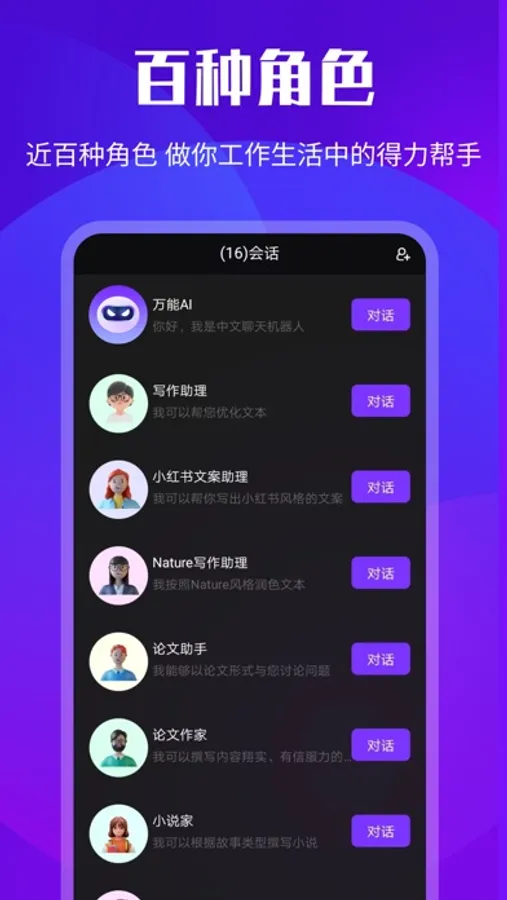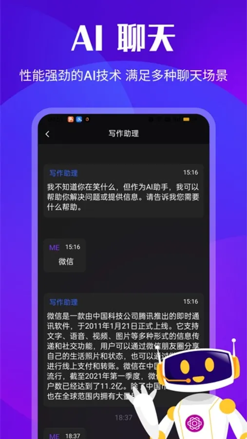这是一款人工智能AI聊天助手,能够与用户进行自然、流畅的对话,回答各种问题,提供个性化的服务。无论您是想聊天、寻求建议还是解决问题,它能都能满足您的需求。