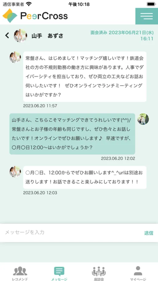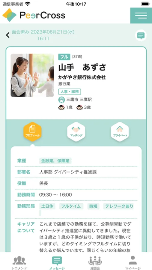 ・マッチングすると、マッチングした相手とアプリ内でメッセージが送れるようになります。メッセージのやり取りで、オンラインかリアルで面会頂き、社外のワーキングマザーの方との出会いをお楽しみください。