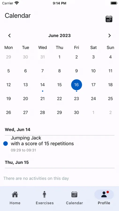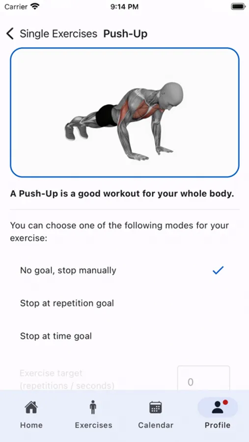 Im Moment haben wir 5 Übungen (Klimmzüge, Sit-Ups, Liegestütze, Kniebeugen und Jumping Jacks) und einige Workouts, die diese kombinieren, implementiert.