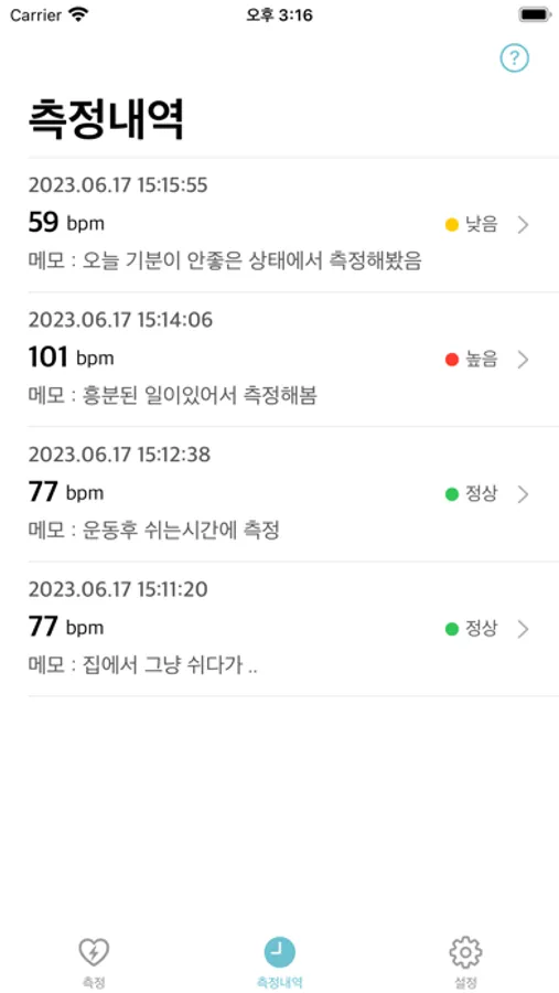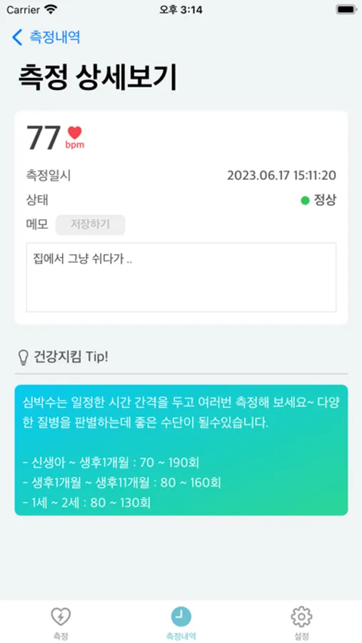 측정한 심박수를 메모와 함께 저장하고 건강을 관리하세요.