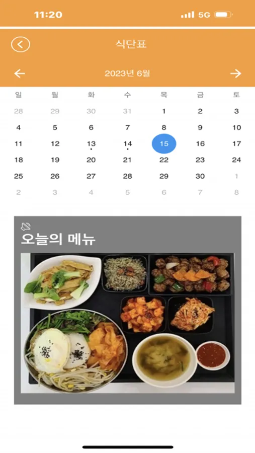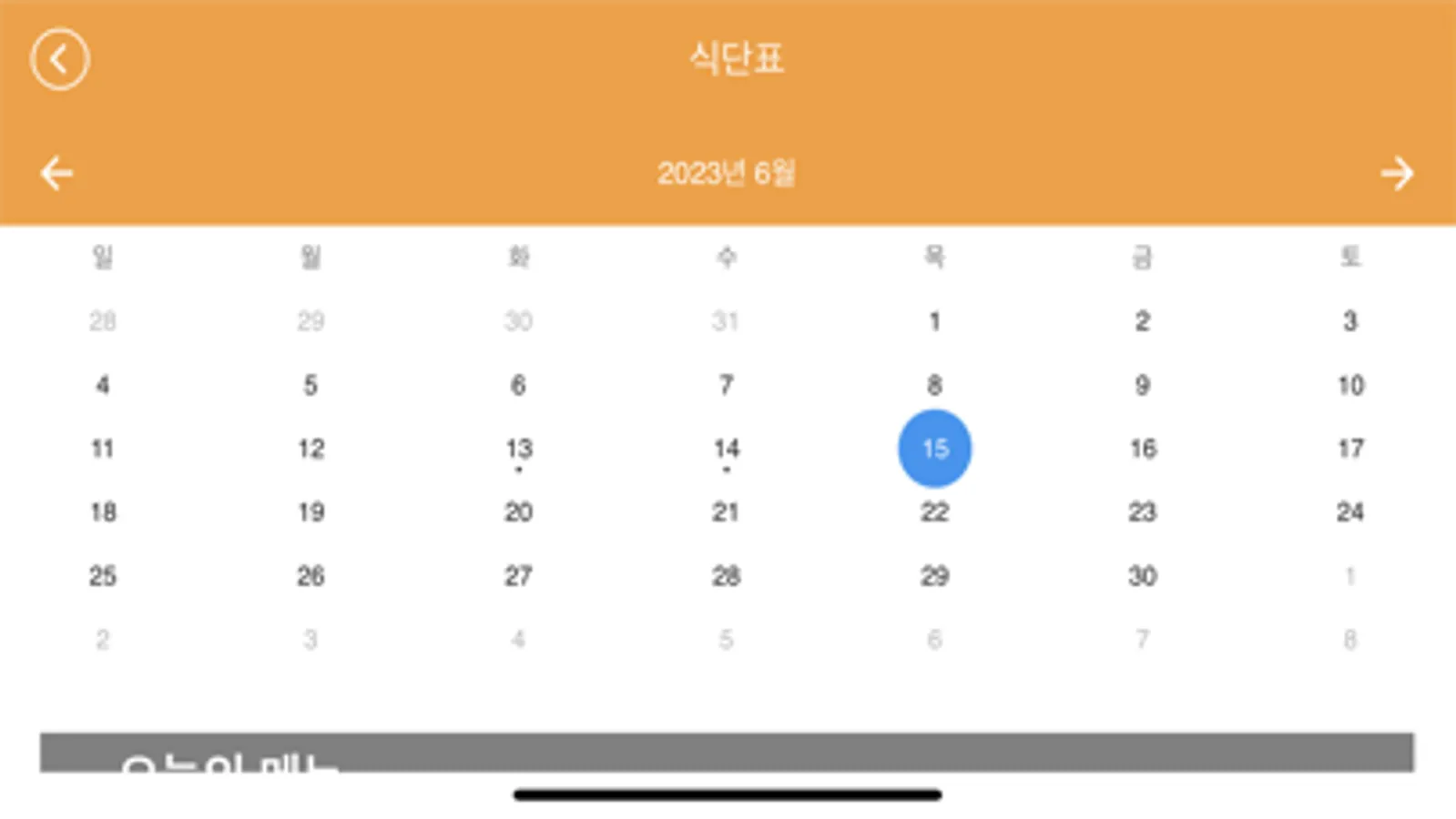 .식단표: 오늘 메뉴와 일자별 식단 카렌더로 제공