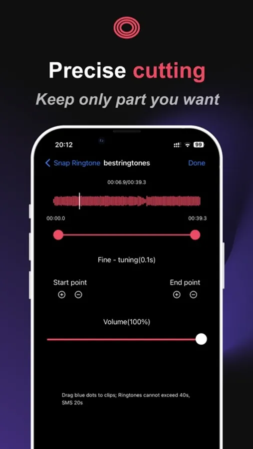 The APP size is only about 10MB after optimization (slight difference between different models). Your iPhone ringtone can be produced quickly after quick downloading. Based on the latest production method, the ringtone production can be completed within several seconds.