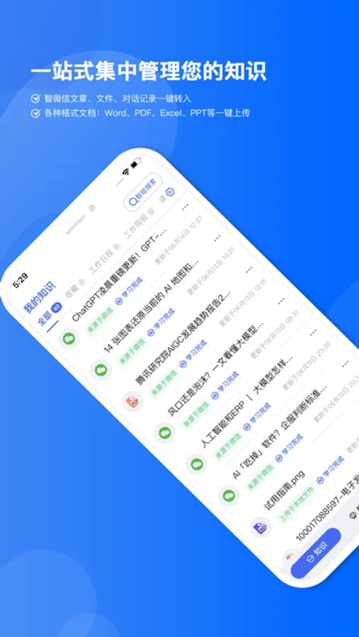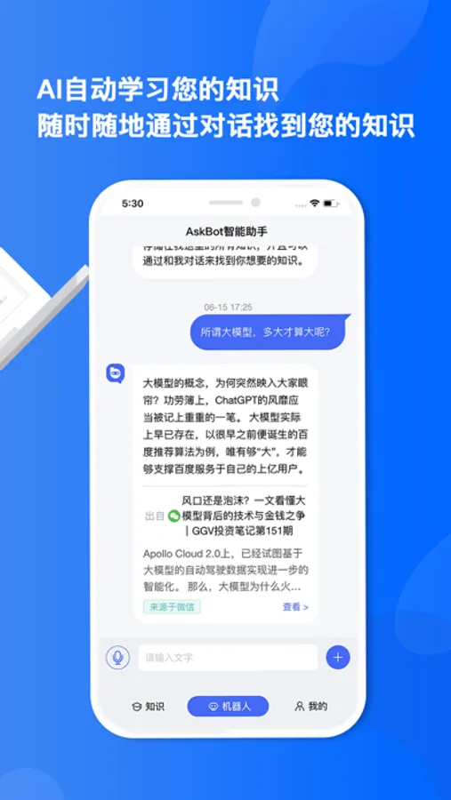 释放您知识的力量,与AskBot智能助手一起畅游知识的海洋!无论是微信知识还是各类文档,让它们统统集中管理,告别繁琐的转移过程。只需一个简单的点击,AskBot就能吸纳您的所有知识。微信文章、对话记录、Word、PDF等各类文档,都能被AI技术自动学习和整理,构建您的知识宝库。无论何时何地,只需与AskBot对话,即可随时获取所需答案。释放您的知识,与AskBot一同探索无限可能!