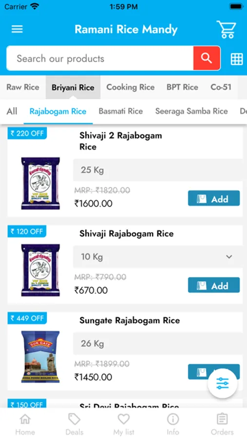 Ramani Rice is deals all types of raw rice, briyani rice, cooking rice, BPT rice,Co-51 . This is a famous store in city. Now they are taking online orders and provide delivery to your door steps.