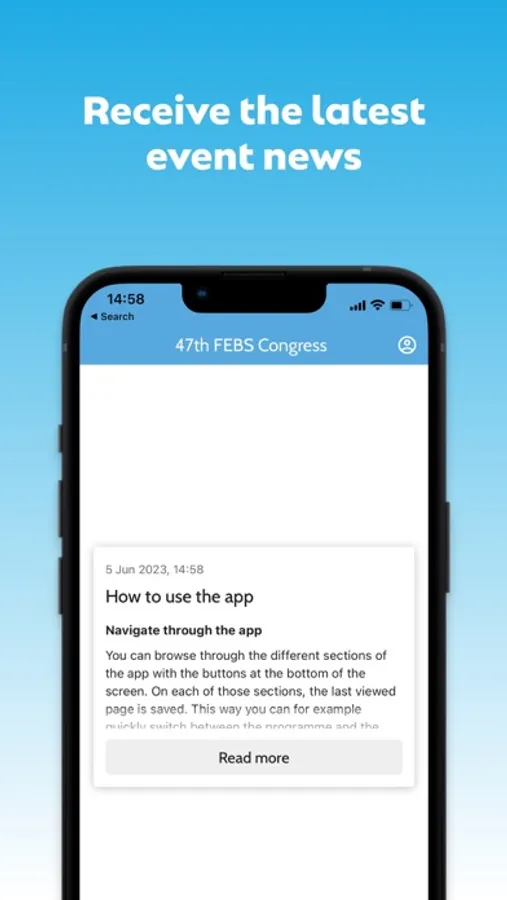 The FEBS Congress 2023 app includes the full programme for the 47th FEBS Congress, a large international meeting for molecular life scientists. The app includes over 800 searchable abstracts summarising the research results that will be presented at the event, as well as presenter lists, floor plans and exhibitor information. Congress delegates can use the app to create their own Congress schedule and take notes, connect with each other via chat, contacts and appointments, and contribute to an event feed.