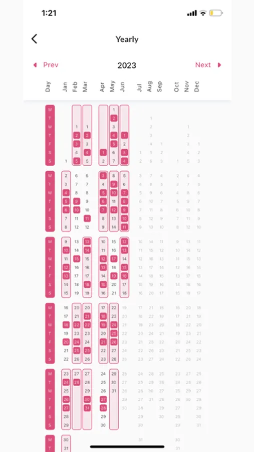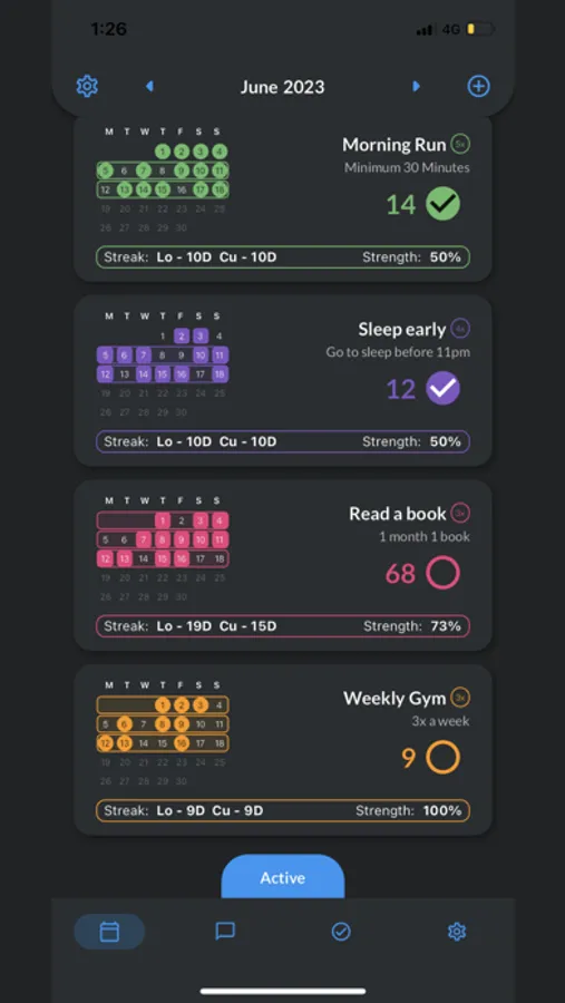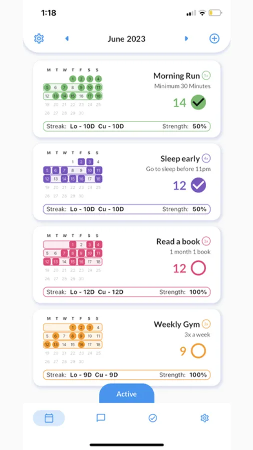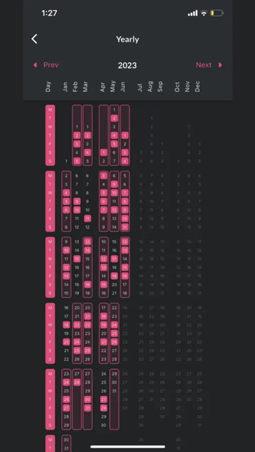 Visualize your habit data on a yearly view to see how your habits have developed over time. The yearly calendar organizes your habits on a weekly basis, allowing you to stay motivated and witness your growth month by month.