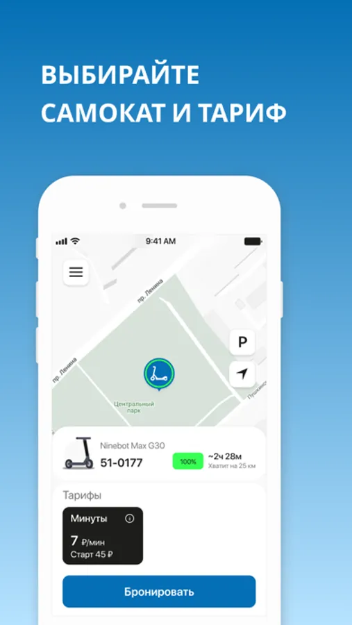 - Найдите ближайший самокат на карте в приложении.