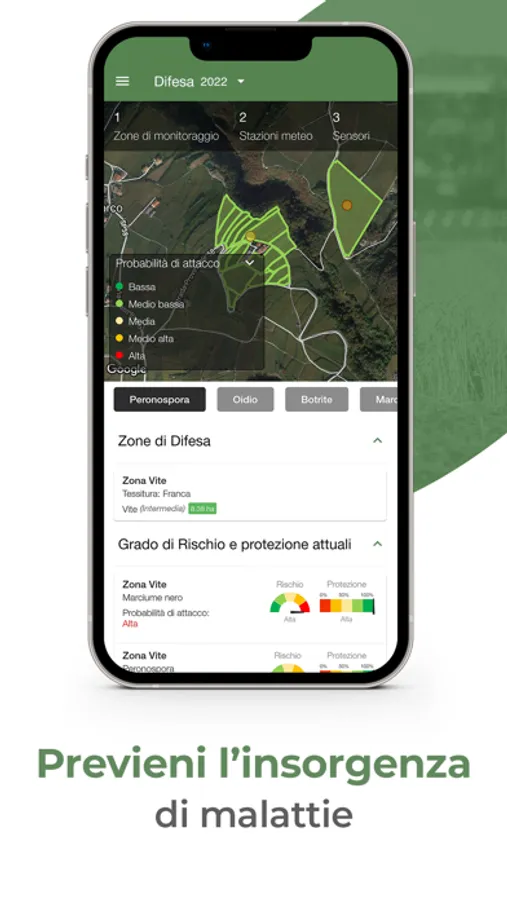 - DIFESA: usa i dati dei sensori per ricevere indicazioni sullo sviluppo delle patologie e difendi le colture in tempo