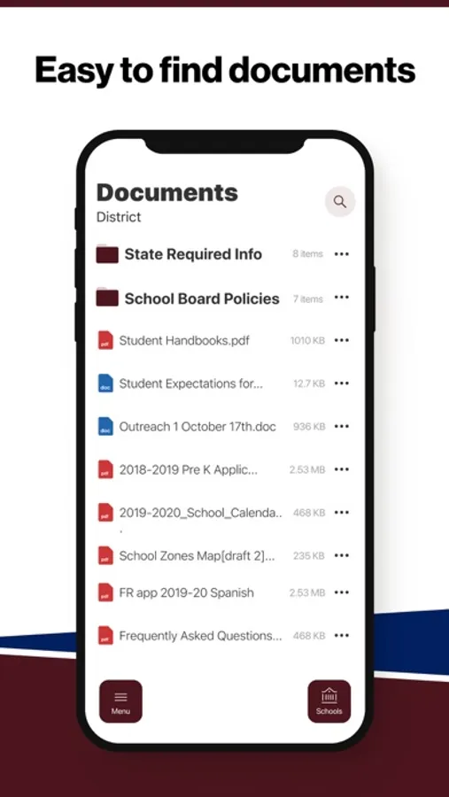 The event section shows a list of events throughout the district. Users can add an event to their calendar to share the event with friends and family with one tap.