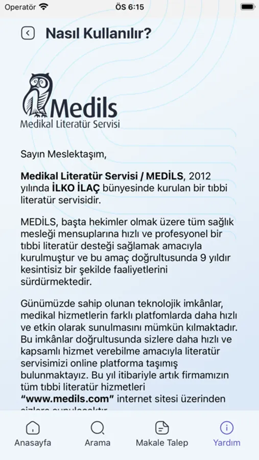 MEDİLS, başta hekimler olmak üzere tüm sağlık mesleği mensuplarına hızlı ve profesyonel bir tıbbi literatür desteği sağlamak amacıyla kurulmuştur ve bu amaç doğrultusunda 9 yıldır kesintisiz bir şekilde faaliyetlerini sürdürmektedir.