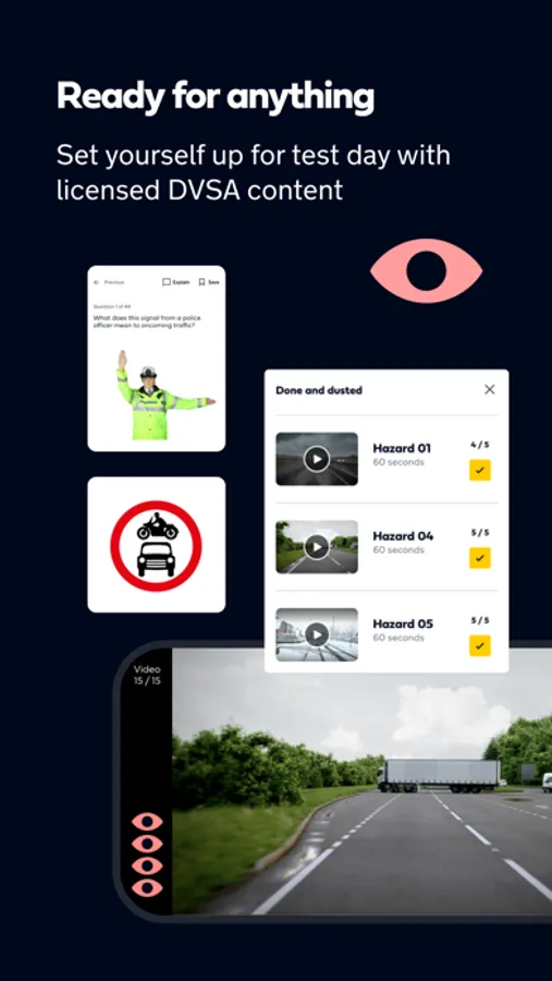 Practise, revise or test yourself at your own pace. Prep with mock theory tests and hazard perception under timed conditions including the DVSA video clip scenarios, just like the real test.