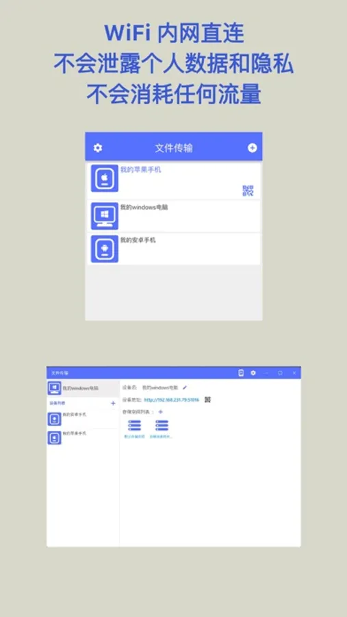 专业的多平台文件传输助手,轻松将你的手机电脑变成个人内网Nas存储空间,支持各个平台的文件共享传输,内网传输更安全,私人数据不会泄漏,保护个人数据和隐私。高速传输共享,速度更快,而且不消耗流量。