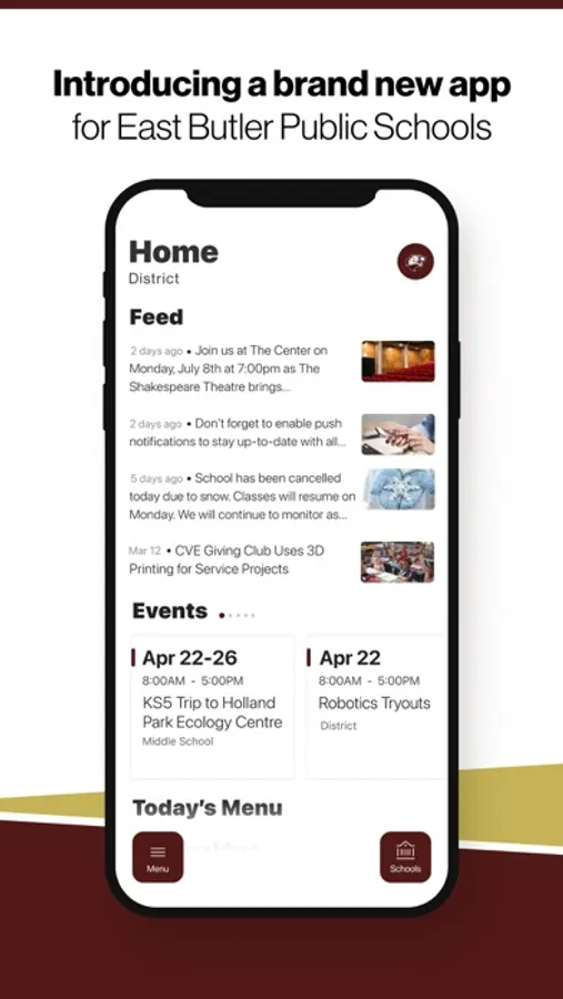 The event section shows a list of events throughout the district. Users can add an event to their calendar to share the event with friends and family with one tap.