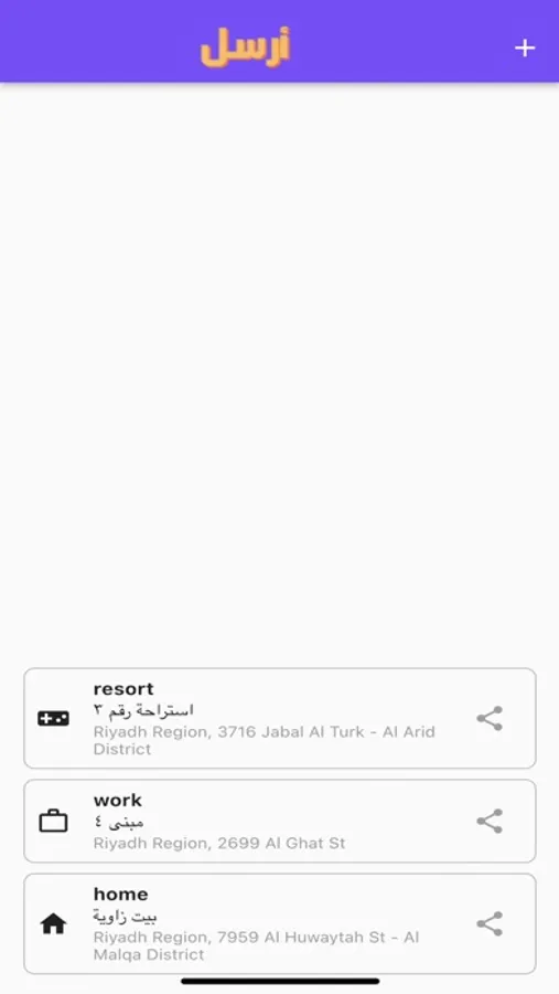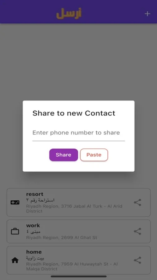 تطبيق أرسل هو تطبيق يساعد المستخدم على مشاركة موقعه بتفاصيل وصور الموقع والمبنى مع أي تطبيق في هاتفه. يتميز التطبيق بميزة رائعة تتيح للمستخدم مشاركة تفاصيل الموقع على الواتساب دون الحاجة إلى حفظ جهة الاتصال. يستخدم التطبيق عادة في مشاركة الموقع مع مندوب التوصيل.