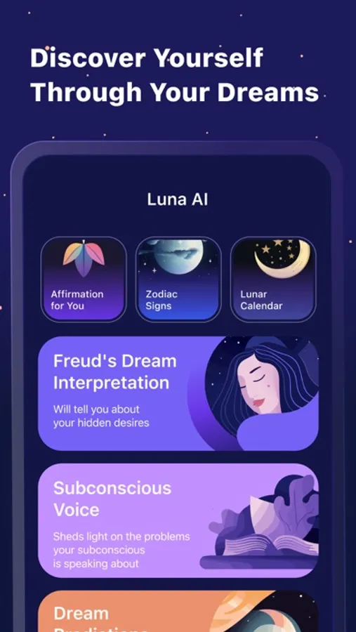 Discover the hidden meanings of your dreams with our dream interpretation mobile app. Luna provides in-depth interpretations by analyzing various popular dream dictionaries.