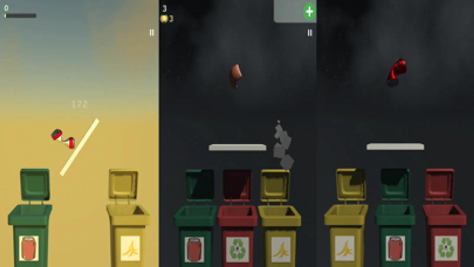 Choose which one of the given bins is the proper for recyclable trash, cans or spoiled food. But be careful, you have limited time until platform will fall down. So try to recycle rubbish as fast as possible and be careful, because bins always get shuffled. Also game has 2 available modes: levels and endless mode. In endless mode you have 3 tries, but on each level any mistake will lead to lose. And game gets harder from level to level. Good luck!