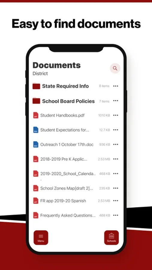 The event section shows a list of events throughout the district. Users can add an event to their calendar to share the event with friends and family with one tap.
