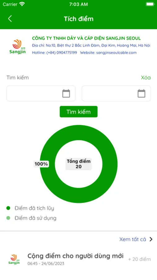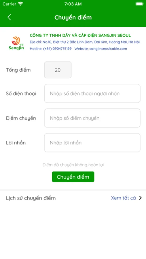 Chuyển điểm giữa các khách hàng của SANG JIN
