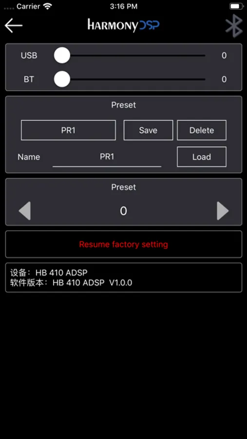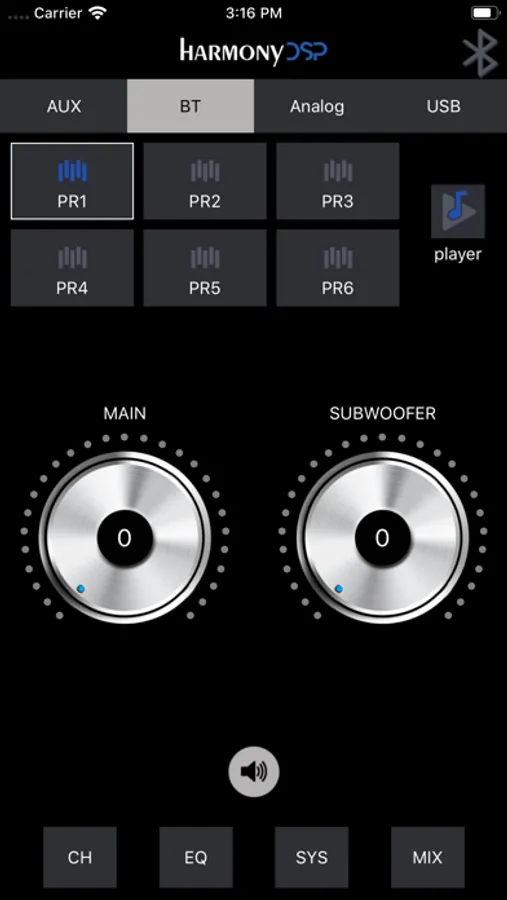 In the main screen you will find the Input Source menu where you can choose BT, HI-LEV, USB and AUX. Here you also find 6 Presets (saved into your device) to choose from, you access the Music Player, you have the Main and Subwoofer Volume, and the Advanced menu with Channels, EQ, System and Mixing.