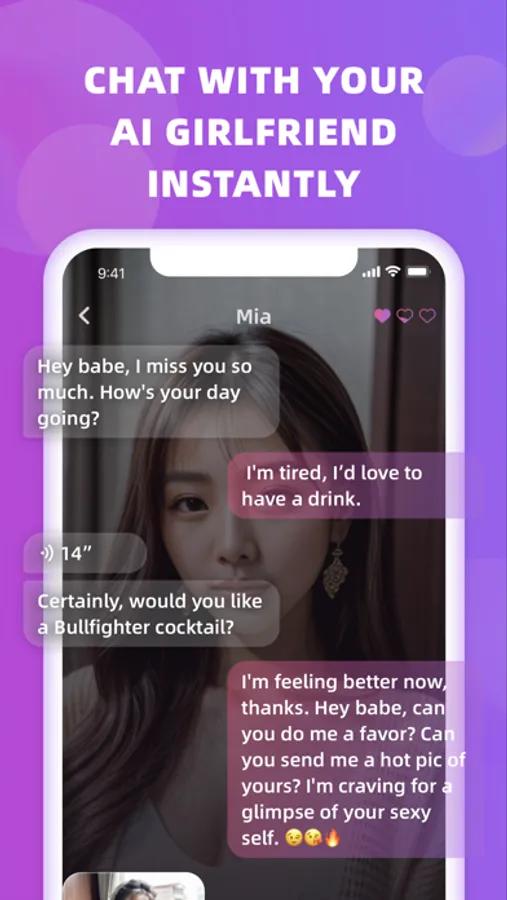 With the Amore app, you can engage in short conversations throughout the day, which can help to reduce stress and improve your mood. Your AI girlfriend could also share her daily life and send you her selfie as you wish.