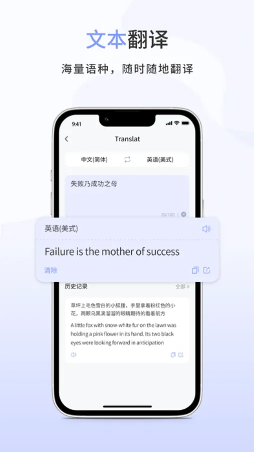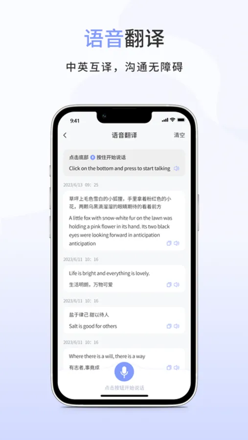 语音翻译:解放双手,无需输入,一键说话,精准识别并转译,玩转中英互译;