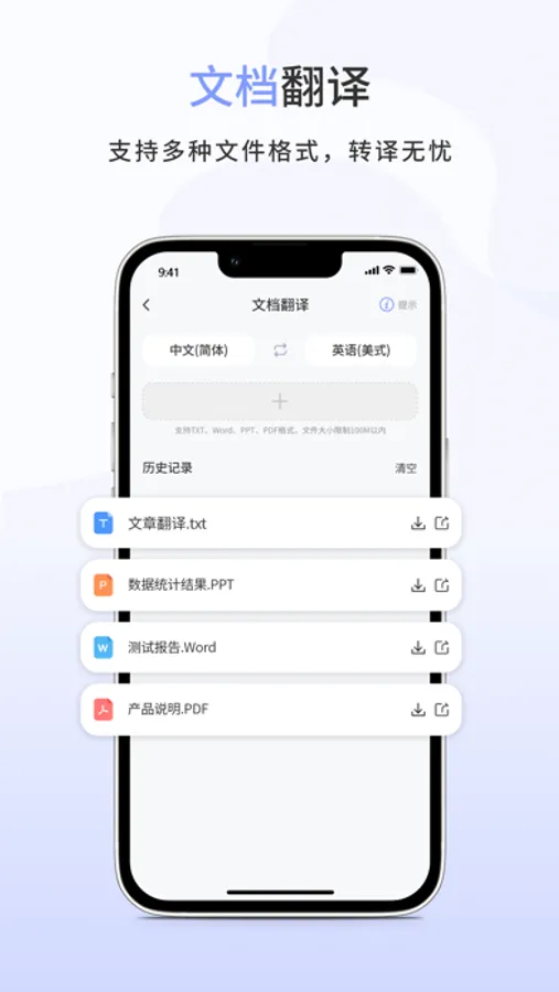 文件翻译:识别并翻译word、ppt、pdf、txt四种文档格式中的文本(支持31种语言互译);