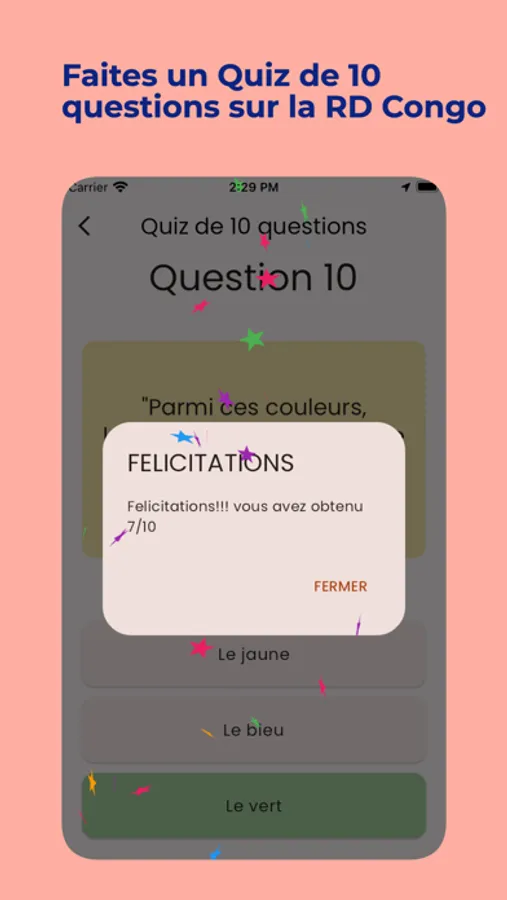 YebaCONGO est une application ludique et éducative, vous pouvez répondre au QUIZ d'une série de 10 questions à choix multiple.