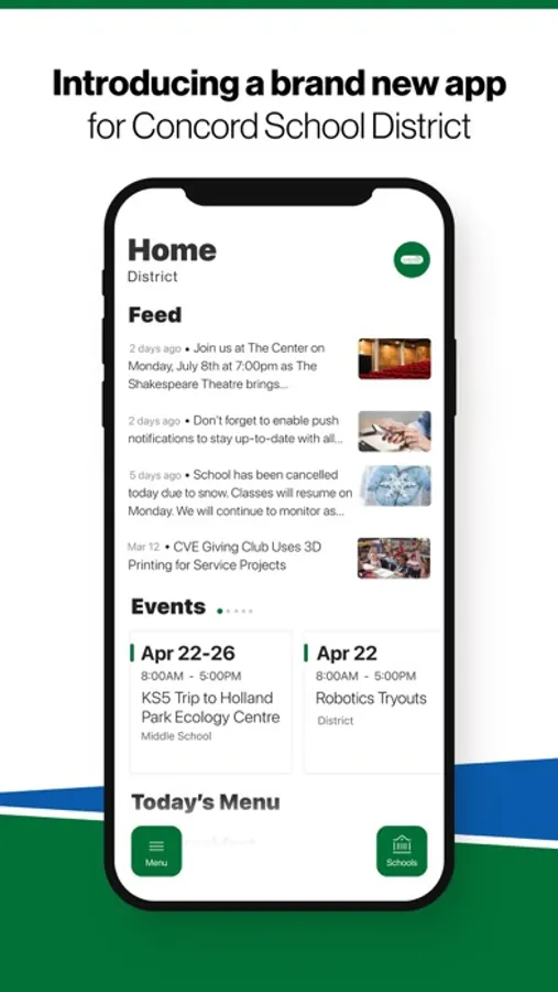 The event section shows a list of events throughout the district. Users can add an event to their calendar to share the event with friends and family with one tap.