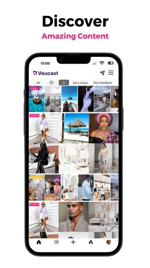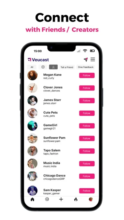 • Veucast will help you find friends and discover new things.