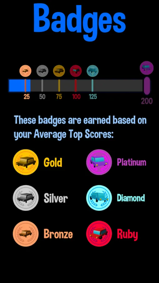 As you progress, the game gets harder, with more red cars spawning as your sedan gets faster. Test your limits as you battle to earn the 6 badges, and grind to complete the average score requirement. Complete tasks to earn different coloured sedans, and battle for a place on the leaderboard to play as the POLICE CAR.