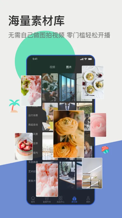 2、【海量素材库】:无需自己做图拍视频,选好背景素材轻松开播。