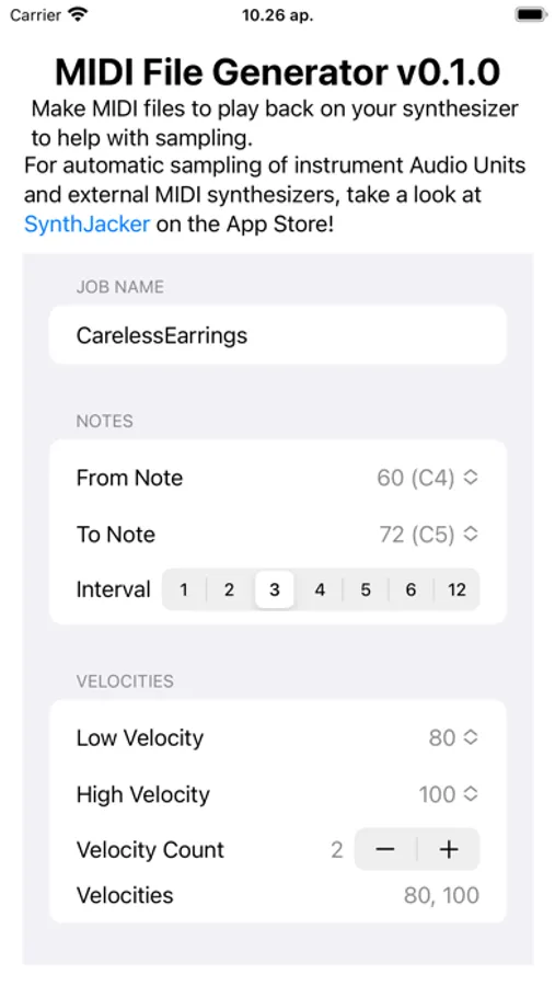 MIDI FIle Generator makes it easy to create MIDI files for sampling music synthesizers. The results can be imported into any Digital Audio Workstation (DAW) app that supports Standard MIDI files. Select the start note, end note, and interval in semitones. Then select the velocities you want. Finally adjust the duration and decay of the note, and the silence between individual notes.