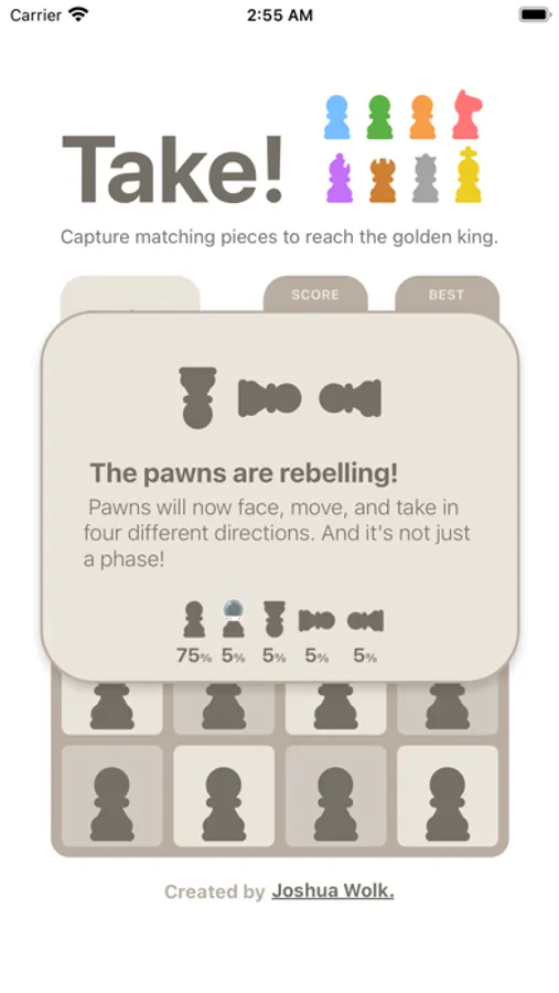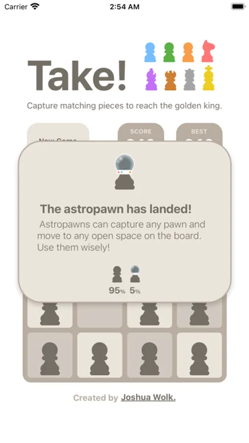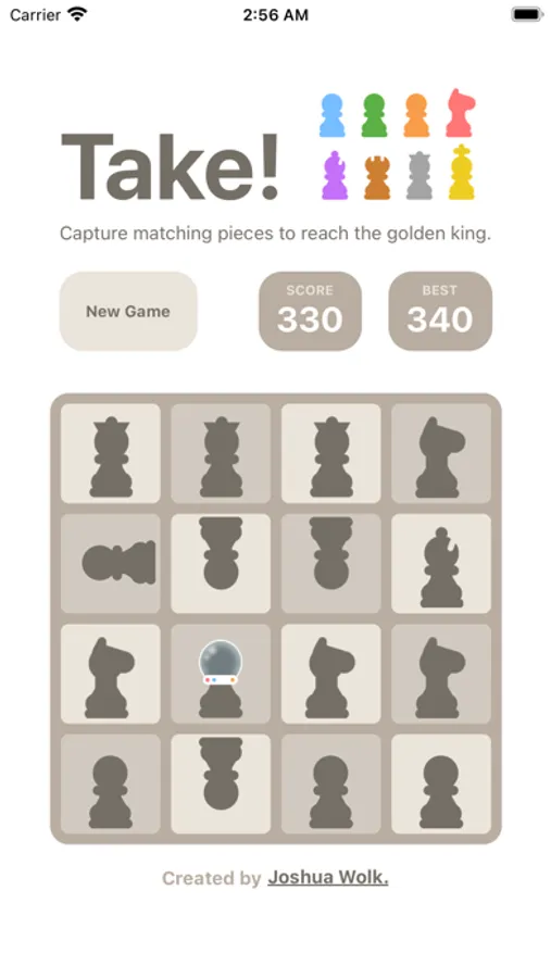 In Take, you navigate a 4-by-4 chess board, capturing matching pieces to level them up to the next piece. Be careful not to trap yourself in a position without any possible moves!