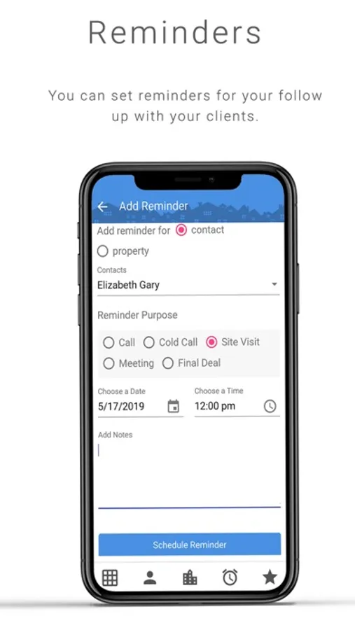 Reminders - You can schedule reminders for your follow-up with your clients. Set up upcoming meetings, follow-ups, and appointments for potential prospects.